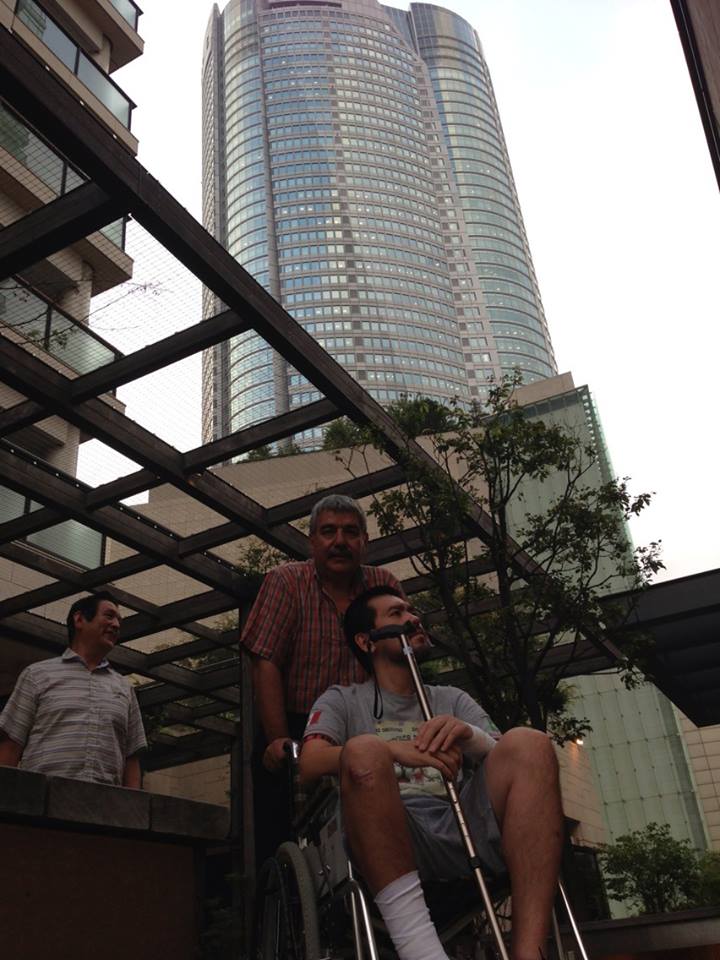 車椅子姿が痛々しいが元気な顔を見せてくれた。