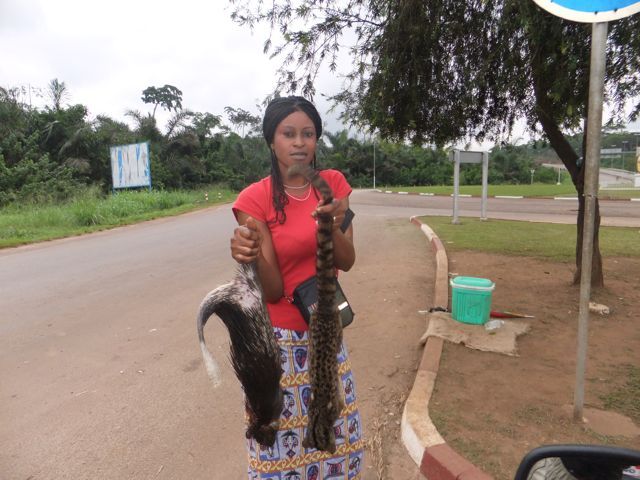朝7:00にカメルーン側国境の町を出発。道の状態が良いので順調に進み、中間の中都市エボロワを抜けヤウンデに到着。ヤウンデ空港からの道のロータリーで両手に何かの商品をぶら下げてる女性がいる。何を持っているのかとみると動物@@ あえてUターンして写真撮影させてもらった。イタチと山猫のようだが何に使うのだろう??(苦笑)