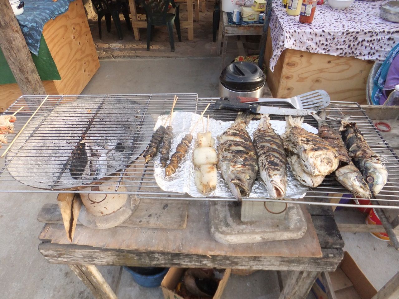 食事処では海の幸が沢山焼かれていて、貝の串に野菜、フランスパンがついて170円。