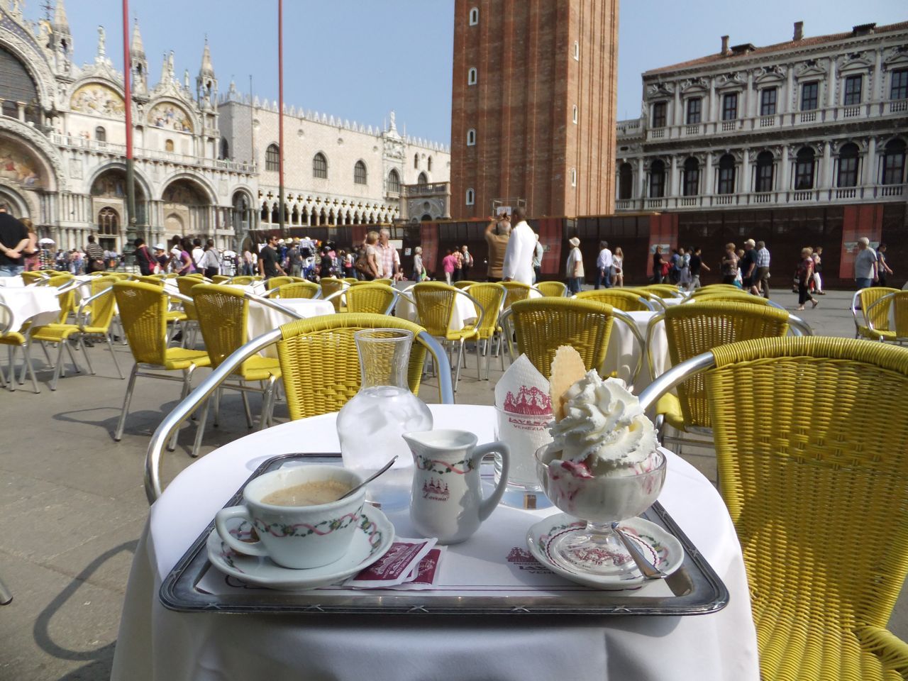 広場のカフェに座り、コーヒーと小さいアイスを注文し、一気に食べる。
