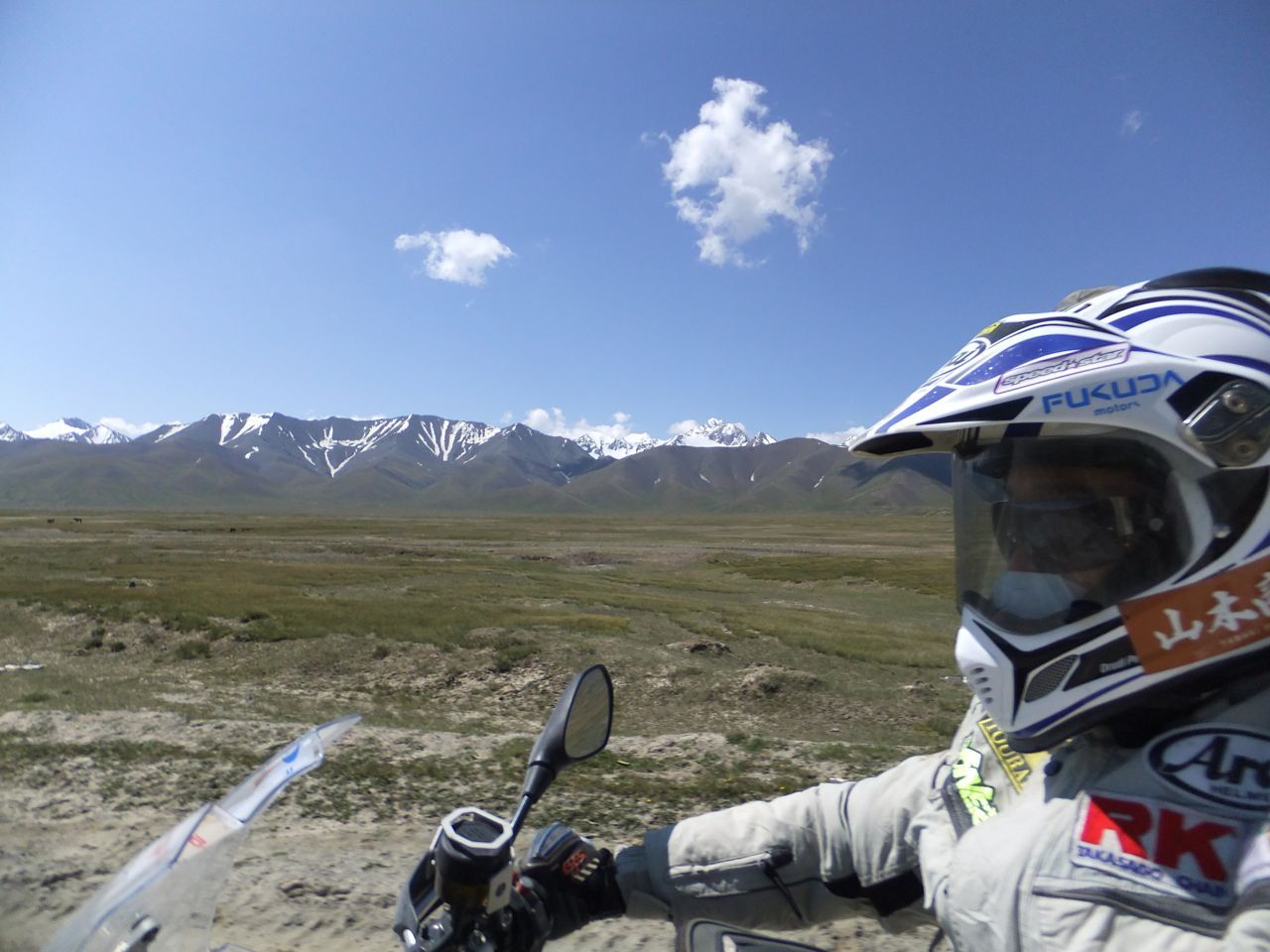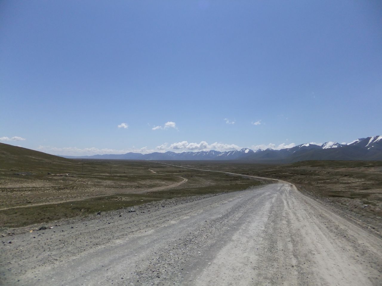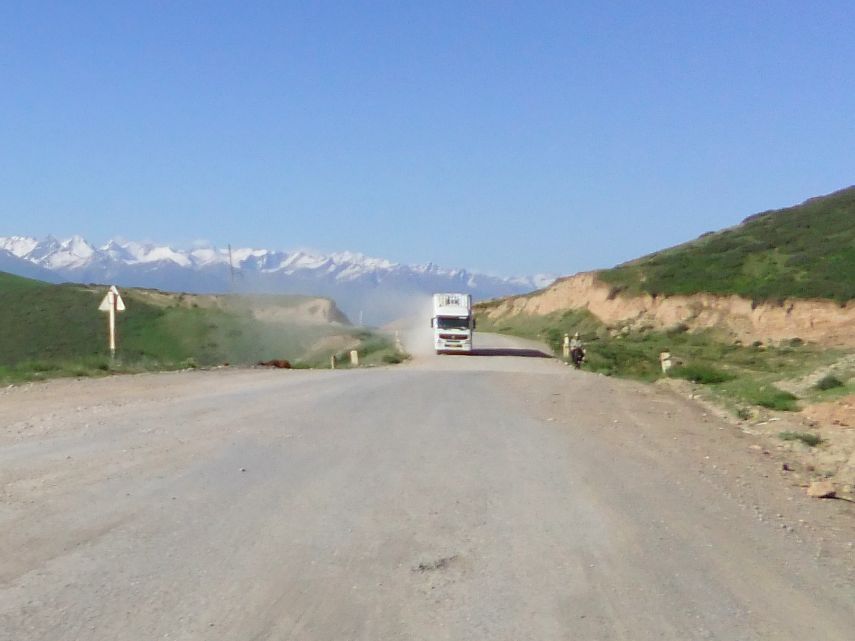 トルガルト峠まで200キロある中、舗装部分は少なく中国間を行き交う大型トラックは多く、バイクが真っ白になるほど。