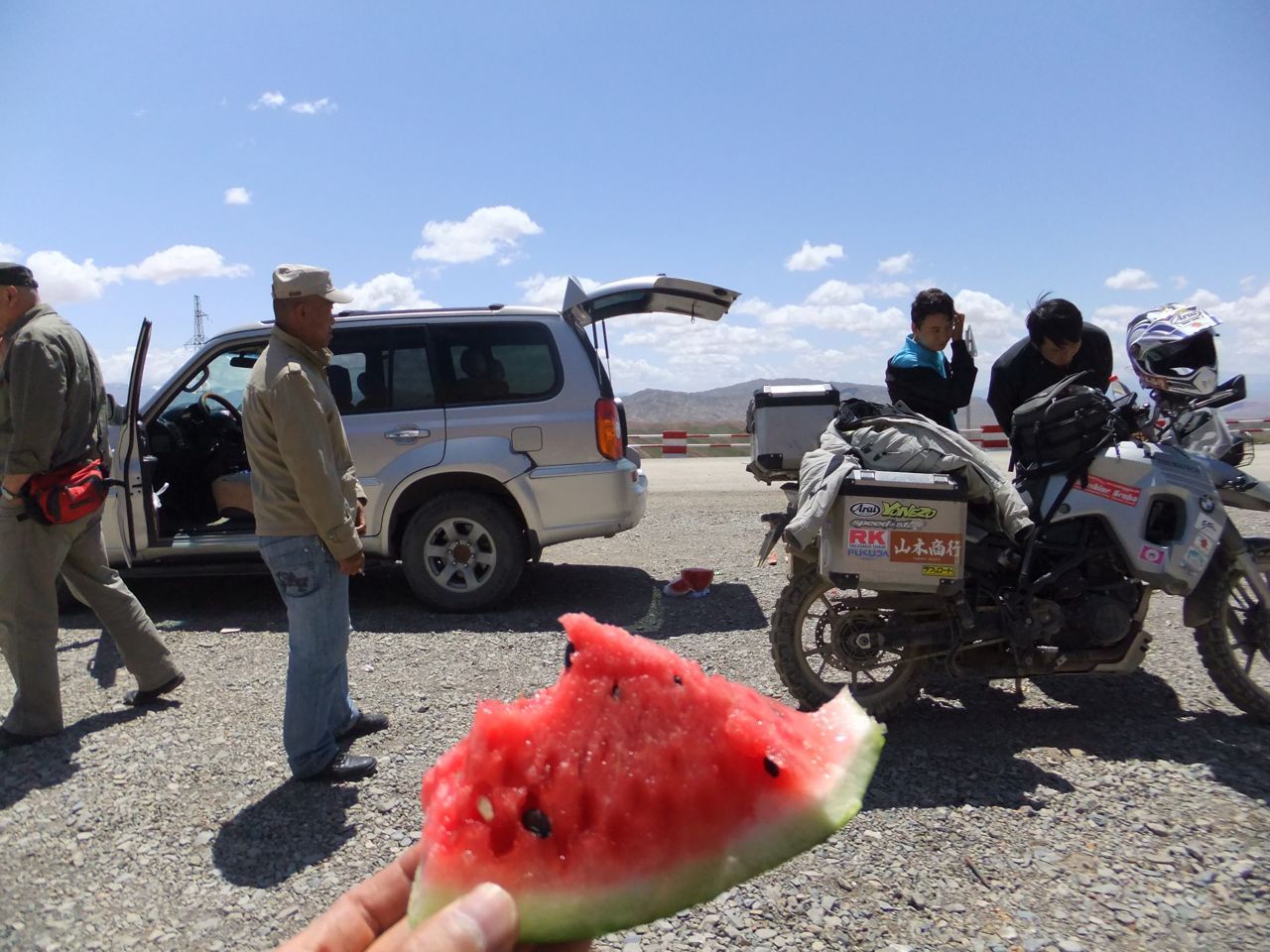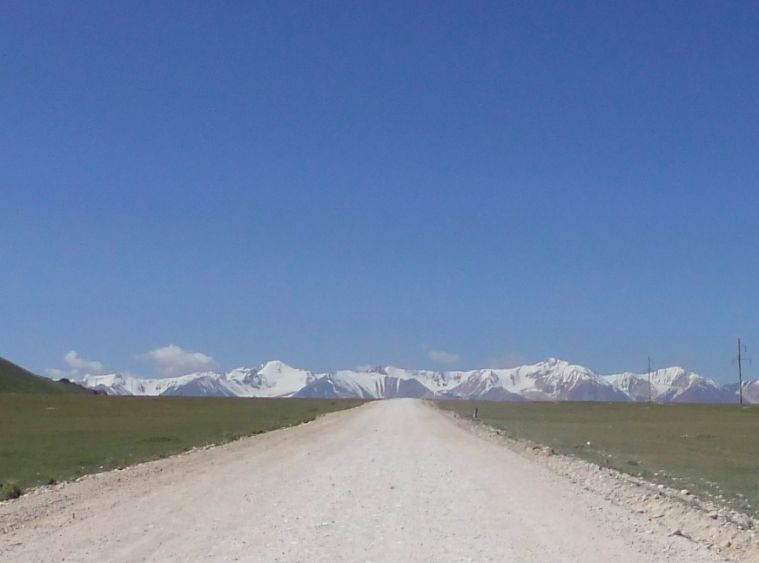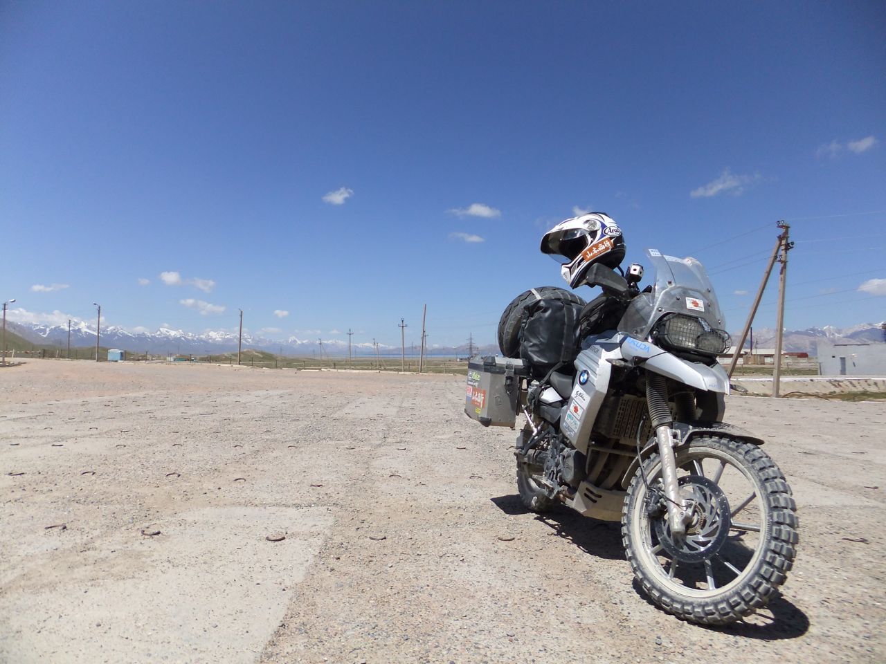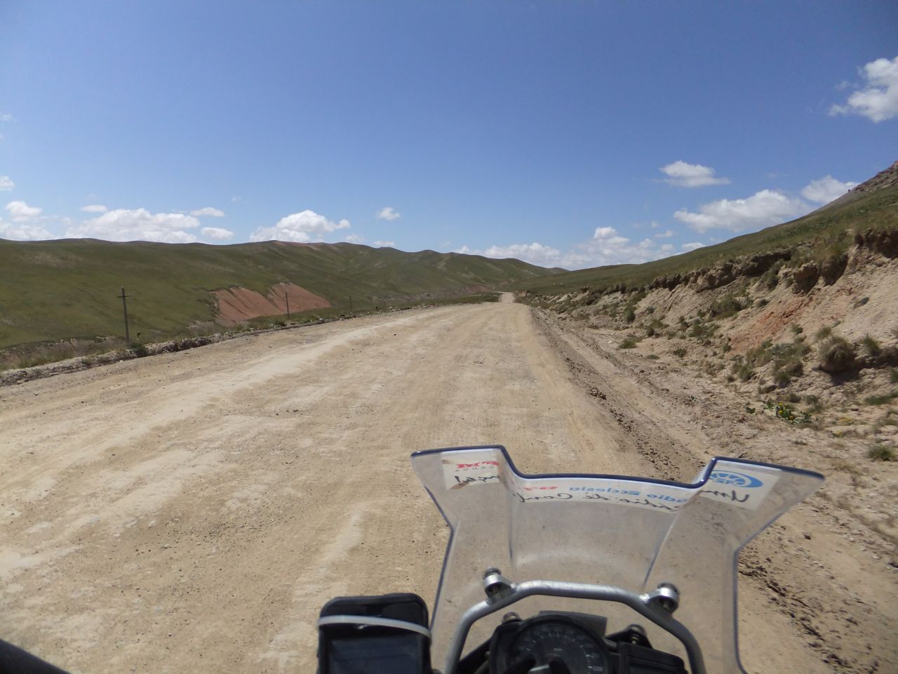トルガルト峠まで200キロある中、舗装部分は少なく中国間を行き交う大型トラックは多く、バイクが真っ白になるほど。