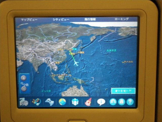 シートに設置されたスクリーンの航行マップがオーストラリアから遠ざかり、アジアへ向かっている。
