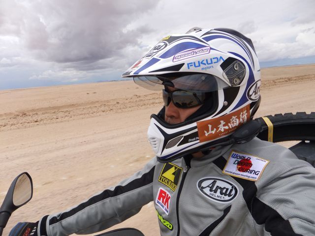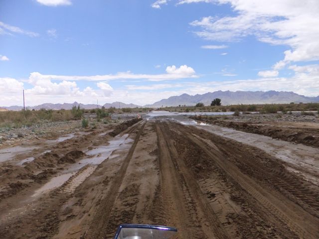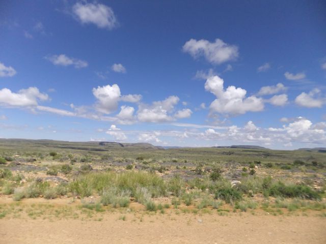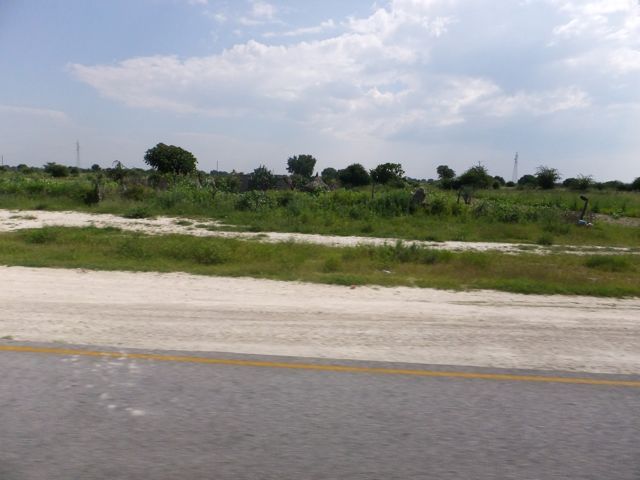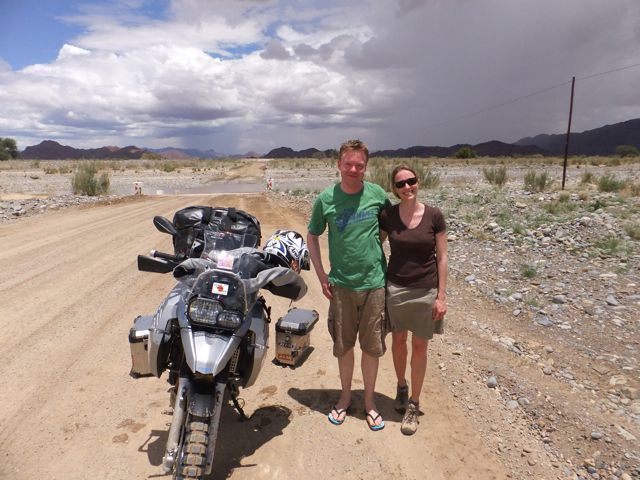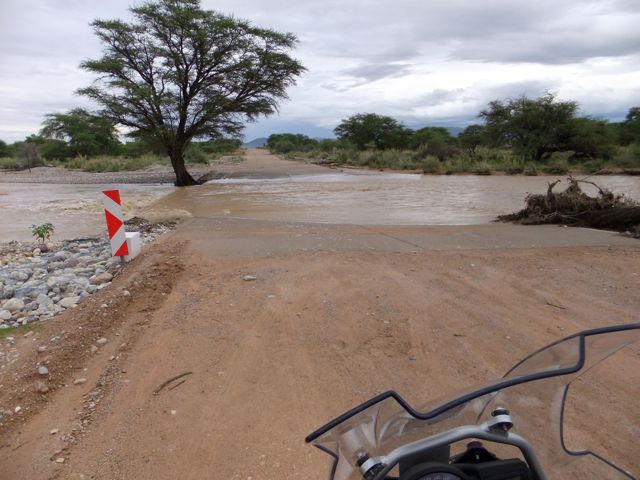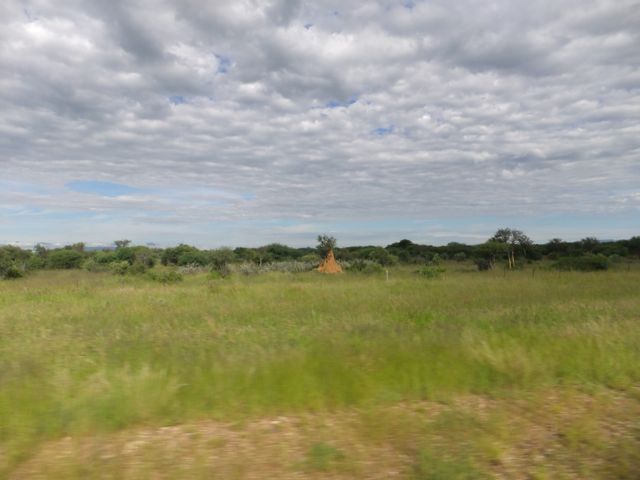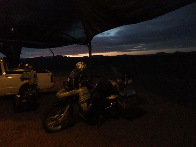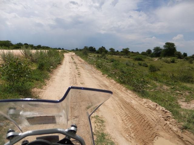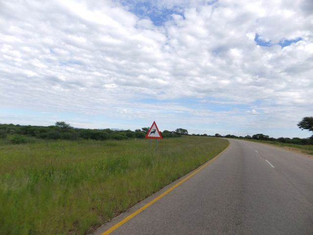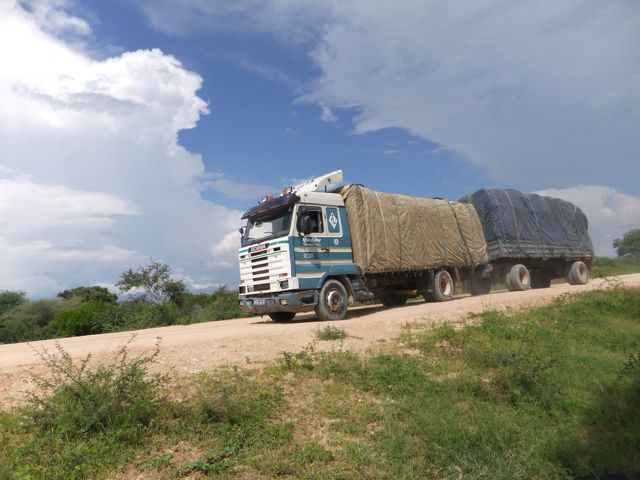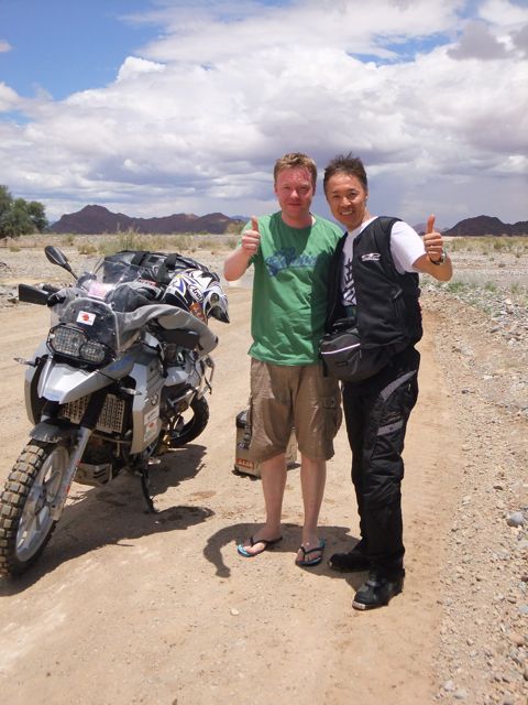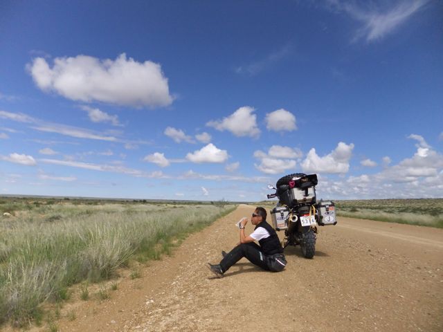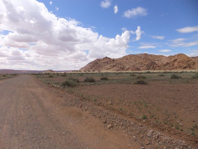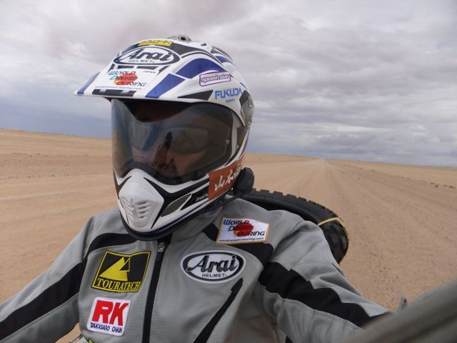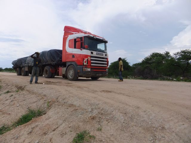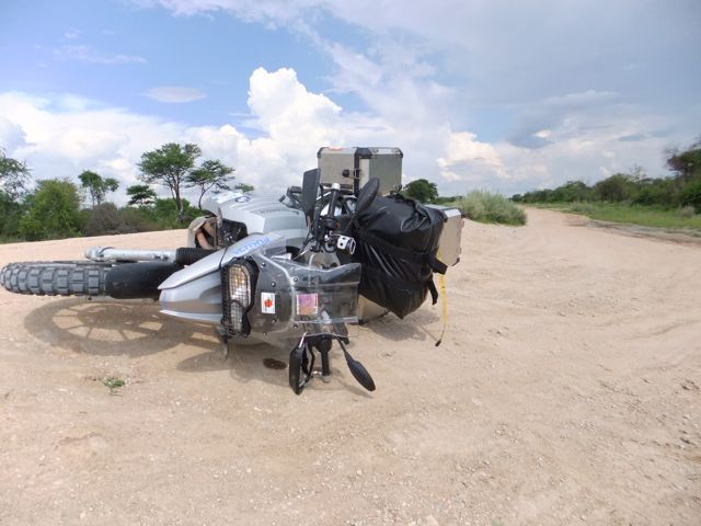 この国道は速度制限が120キロのところと60キロのところが交互にありそこを走行しながらルバンゴまでの到着時刻を計算する。この調子で行けば夕方には着くだろう。などど考えながら走行していると突然また悪路に。。今度は国境を超えたところの道の状態よりさらに悪い。ギアを二速に入れることができず、平均速度は15キロほどまで落ちる。デカイ穴に落ちないようによけ、またどうしようも無い時は超低速で穴を超えていく。ただアスファルトが断裂し崖崩れ状態、深い陥没の穴にはまったら転倒間違いなしなので本当に神経を使う。道の面積の内、95%が穴で残り5%が平面と言えば想像がつくでしょうか。大型トレーラー達も皆この道を通るので本当に辛そう。車輪が沢山ある分、バイクよりもゆっくりだ。 結果この状態の道が延々、100キロほど続くことになる。途中、部分的にこの酷い国道をさけるために多くのドライバーが走った自然に出来た側道がある。その道は幾分が走り易くギアをたまに二速に入れることが出来る。ただその道も大きな水たまりが途中に立ちはだかるので国道に復帰しなければいけない。国道は高い位置を走っていて側道は低い位置にあるので側道へ下るのと駆け上がるのをしばらくはそれを繰り返すことになる。ある時、側道から国道へ復帰しようとした時、路面の大きなギャップがバイクの底をヒットした反動で転倒してしまった。今回は傾斜が低い方向へバイクが倒れ、私自身は地面を転がることになった!地面を転がったのは久しぶりだ(笑) もちろん低速での転倒だったのと完全な装備のお陰でケガもない。ありがとう!ラフアンドロードとBMWのブーツ&グローブ、アライのヘルメット!(笑) バイクはタイヤのほうがハンドルより高い位置の状態で横たわっている!全ての荷物を降ろしてもそのままでは起こすことが出来ない。。お手上げ状態のところに反対側からやってきたトレーラーの運転手が声をかけてくれ助手の方と共に起こすのを手伝ってくれた(感涙)皆、困っている人をすぐに助ける習慣は本当に素晴らしい。やっとの思いでバイクに荷物を積んでいる最中今度は反対側にバイクを倒してしまった(恥)相当疲れているらしい。いつ終わるか判らない悪路を走り続けるのは本当に辛い。セスリエムからスワコプムンドに向かう長いダートは天国のように思えるほど。途中から常に気にし始めていたのは太陽の傾き。超低速走行のために一向に走行距離が伸びない。本日の目的地、ルバンゴに到着する予定の時間がどんどん遅くなっていく。暗闇になった場合、この悪路を走るのは自殺行為だ。とは言っても無情に時間が過ぎ、悪路は容赦なく続く。やっと奇麗な舗装路に出た!(嬉)ここからあとはルバンゴまで一直線!と思ったのはつかの間、すぐにまた悪路に。この精神的ショック、皆様わかります?(笑) どんどん日が暮れていく。16;00を過ぎた頃からトレーラー達が路上に車を停めて車泊の準備を始める光景を見かけるようになった。中には荷台の下と路面の間にベッドを取り付けている車も見た。そうして長い距離を走っていくんだね。 私ももう今日中にルバンゴに着くのは無理と判断しどこかで泊まらないといけない。しかし私はテントを持っていない。その辺にバイクを停めて寝る・・と言う事は無理なのだ。何か大きい土管を探すか、または人がいる村に行って馬小屋でもいいから寝床を提供してもらうかと考えるが人も歩いていない地域が続く。またもし寝る場所を確保出来たとしても食料がない。少しだけバイクにビスケットが積んである。水もあと僅か。こう考えると国境で渡してしまったリンゴ二個と国境屋に飲ませた水が愛おしく感じてしまった。