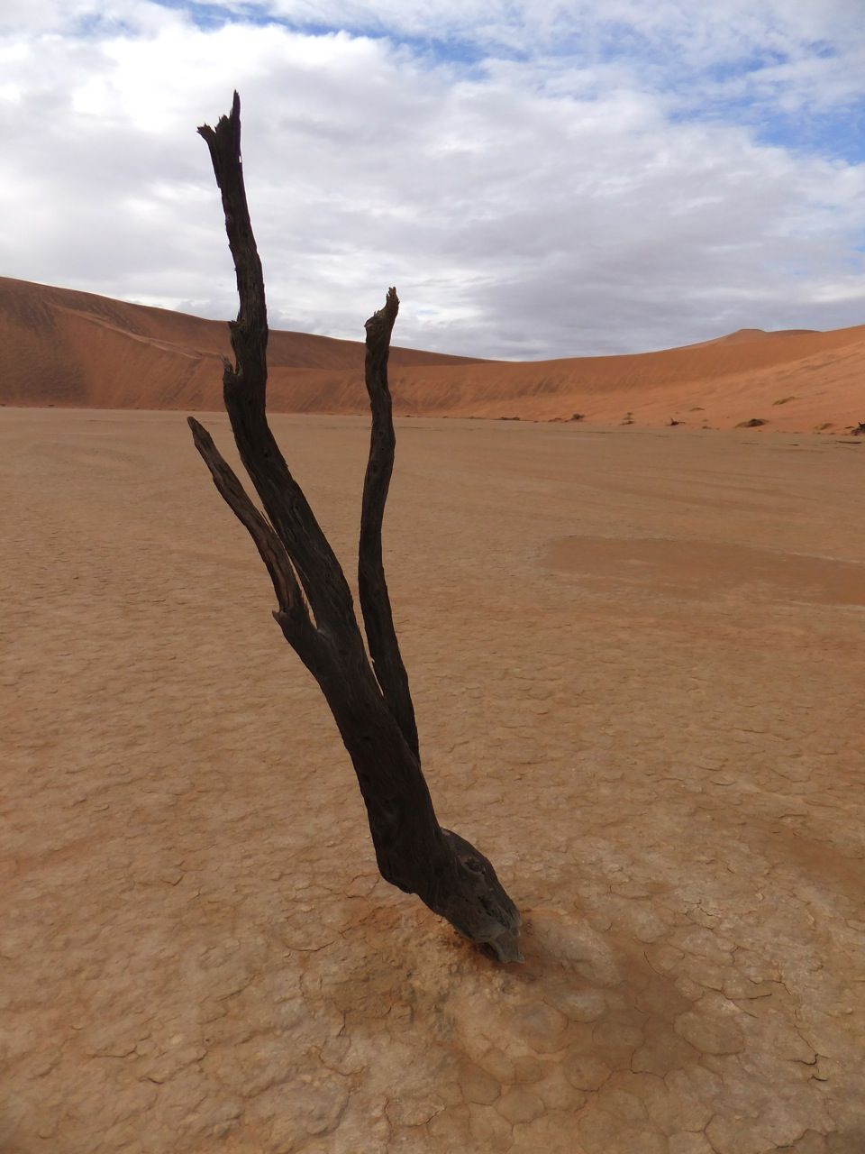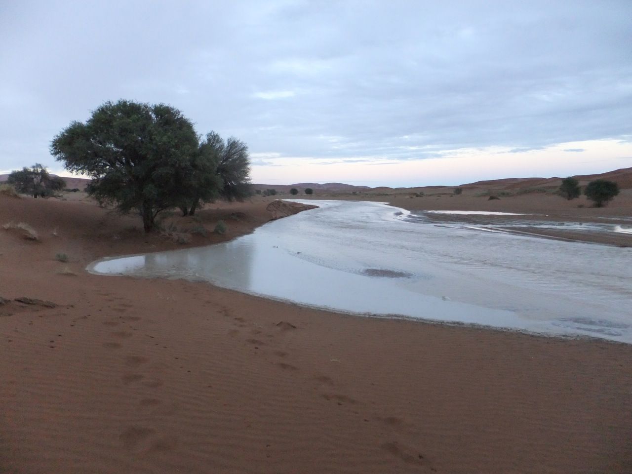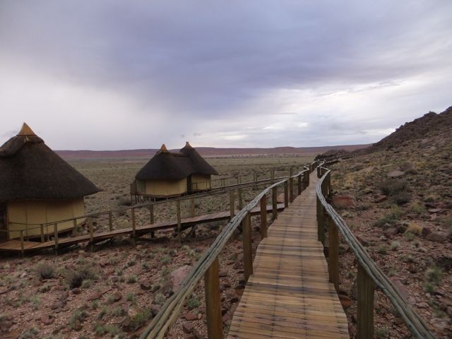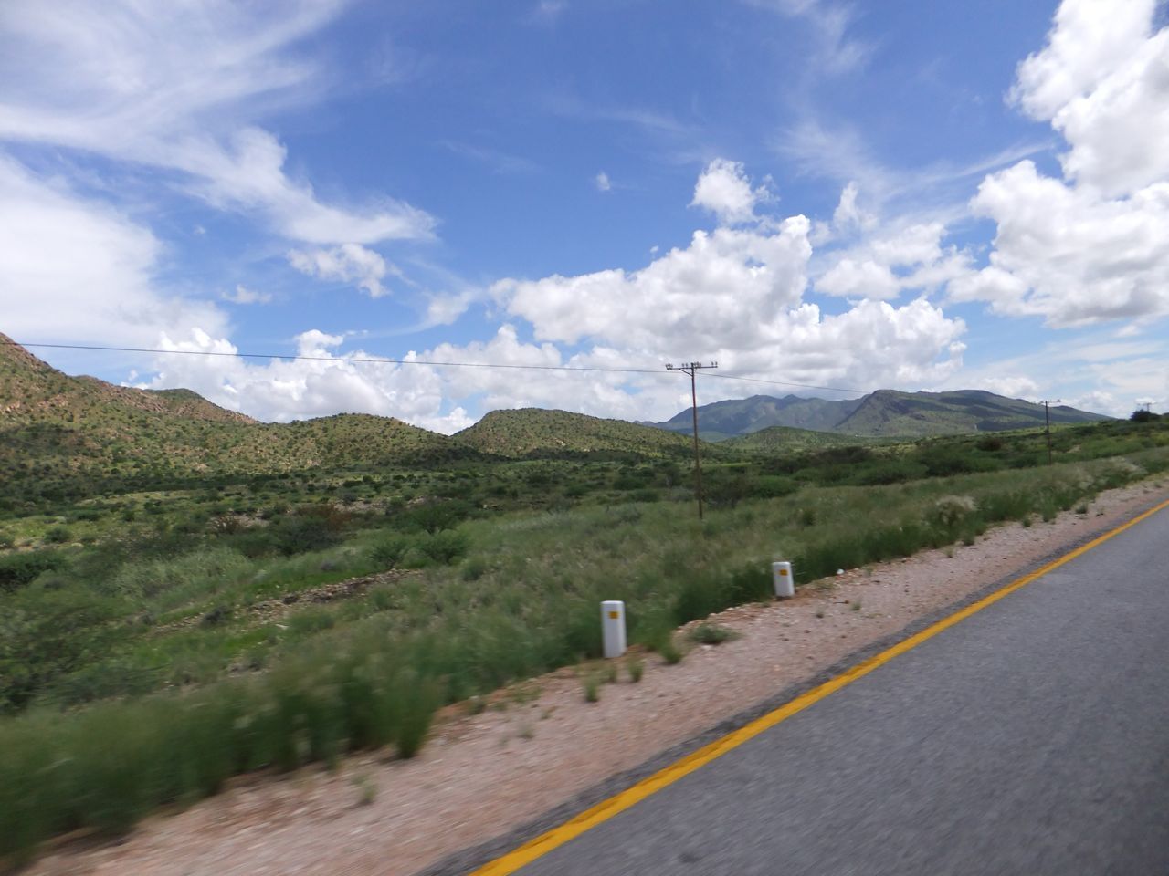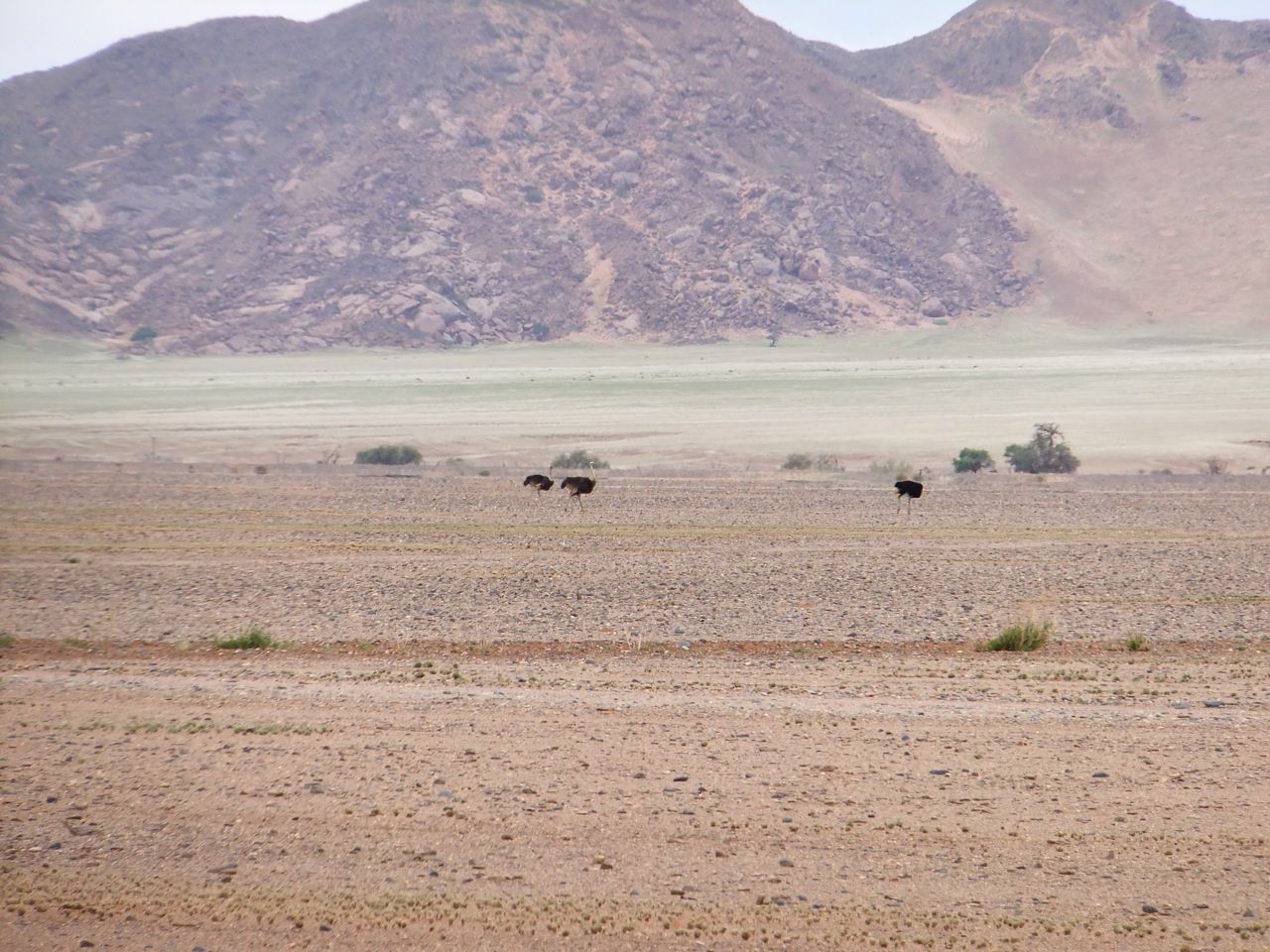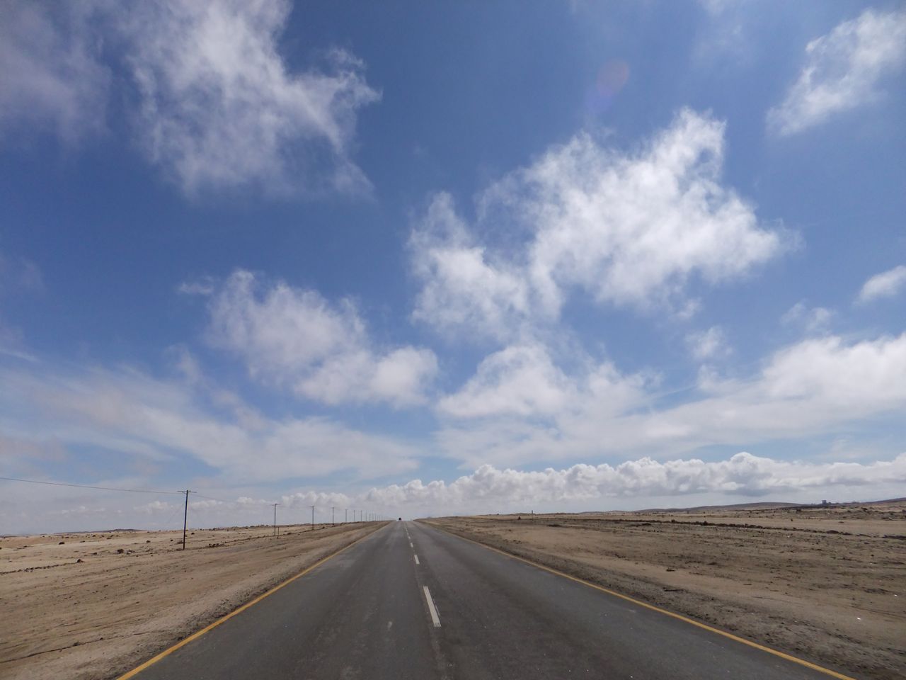 この国道は速度制限が120キロのところと60キロのところが交互にありそこを走行しながらルバンゴまでの到着時刻を計算する。この調子で行けば夕方には着くだろう。などど考えながら走行していると突然また悪路に。。今度は国境を超えたところの道の状態よりさらに悪い。ギアを二速に入れることができず、平均速度は15キロほどまで落ちる。デカイ穴に落ちないようによけ、またどうしようも無い時は超低速で穴を超えていく。ただアスファルトが断裂し崖崩れ状態、深い陥没の穴にはまったら転倒間違いなしなので本当に神経を使う。道の面積の内、95%が穴で残り5%が平面と言えば想像がつくでしょうか。大型トレーラー達も皆この道を通るので本当に辛そう。車輪が沢山ある分、バイクよりもゆっくりだ。 結果この状態の道が延々、100キロほど続くことになる。途中、部分的にこの酷い国道をさけるために多くのドライバーが走った自然に出来た側道がある。その道は幾分が走り易くギアをたまに二速に入れることが出来る。ただその道も大きな水たまりが途中に立ちはだかるので国道に復帰しなければいけない。国道は高い位置を走っていて側道は低い位置にあるので側道へ下るのと駆け上がるのをしばらくはそれを繰り返すことになる。ある時、側道から国道へ復帰しようとした時、路面の大きなギャップがバイクの底をヒットした反動で転倒してしまった。今回は傾斜が低い方向へバイクが倒れ、私自身は地面を転がることになった!地面を転がったのは久しぶりだ(笑) もちろん低速での転倒だったのと完全な装備のお陰でケガもない。ありがとう!ラフアンドロードとBMWのブーツ&グローブ、アライのヘルメット!(笑) バイクはタイヤのほうがハンドルより高い位置の状態で横たわっている!全ての荷物を降ろしてもそのままでは起こすことが出来ない。。お手上げ状態のところに反対側からやってきたトレーラーの運転手が声をかけてくれ助手の方と共に起こすのを手伝ってくれた(感涙)皆、困っている人をすぐに助ける習慣は本当に素晴らしい。やっとの思いでバイクに荷物を積んでいる最中今度は反対側にバイクを倒してしまった(恥)相当疲れているらしい。いつ終わるか判らない悪路を走り続けるのは本当に辛い。セスリエムからスワコプムンドに向かう長いダートは天国のように思えるほど。途中から常に気にし始めていたのは太陽の傾き。超低速走行のために一向に走行距離が伸びない。本日の目的地、ルバンゴに到着する予定の時間がどんどん遅くなっていく。暗闇になった場合、この悪路を走るのは自殺行為だ。とは言っても無情に時間が過ぎ、悪路は容赦なく続く。やっと奇麗な舗装路に出た!(嬉)ここからあとはルバンゴまで一直線!と思ったのはつかの間、すぐにまた悪路に。この精神的ショック、皆様わかります?(笑) どんどん日が暮れていく。16;00を過ぎた頃からトレーラー達が路上に車を停めて車泊の準備を始める光景を見かけるようになった。中には荷台の下と路面の間にベッドを取り付けている車も見た。そうして長い距離を走っていくんだね。 私ももう今日中にルバンゴに着くのは無理と判断しどこかで泊まらないといけない。しかし私はテントを持っていない。その辺にバイクを停めて寝る・・と言う事は無理なのだ。何か大きい土管を探すか、または人がいる村に行って馬小屋でもいいから寝床を提供してもらうかと考えるが人も歩いていない地域が続く。またもし寝る場所を確保出来たとしても食料がない。少しだけバイクにビスケットが積んである。水もあと僅か。こう考えると国境で渡してしまったリンゴ二個と国境屋に飲ませた水が愛おしく感じてしまった。