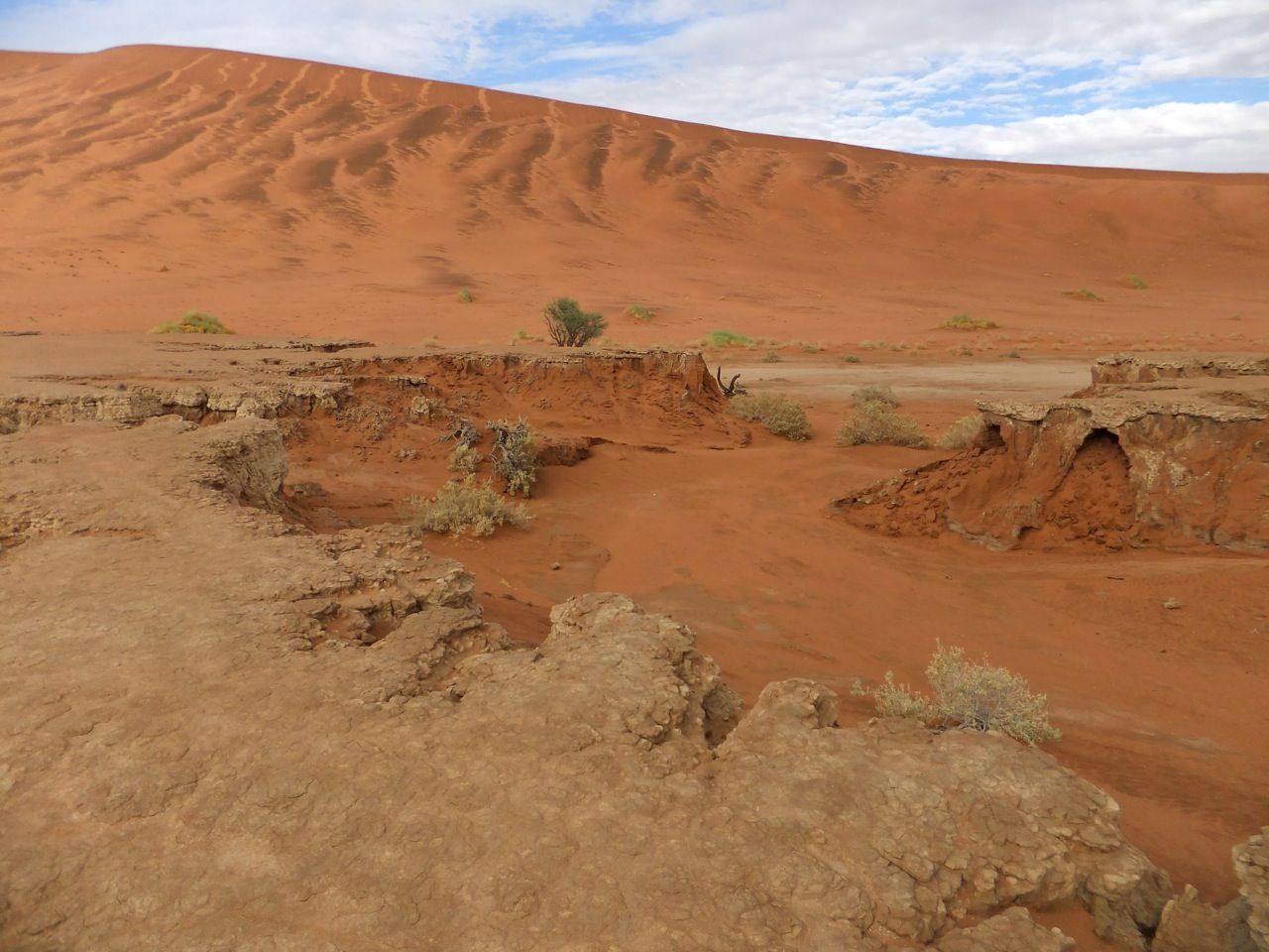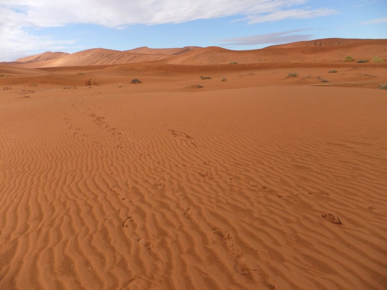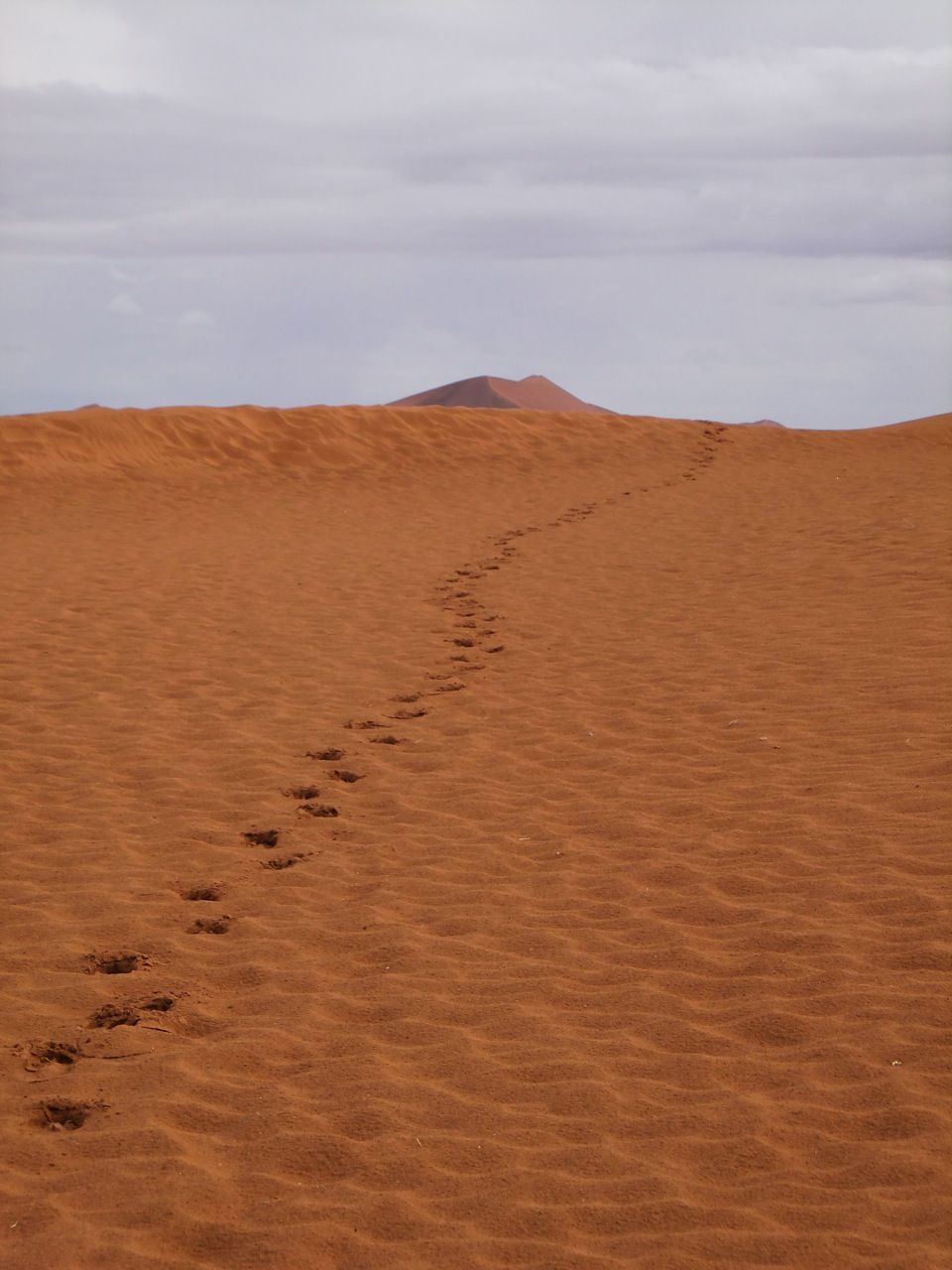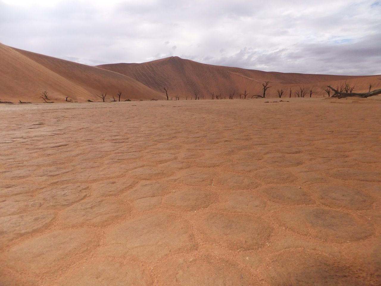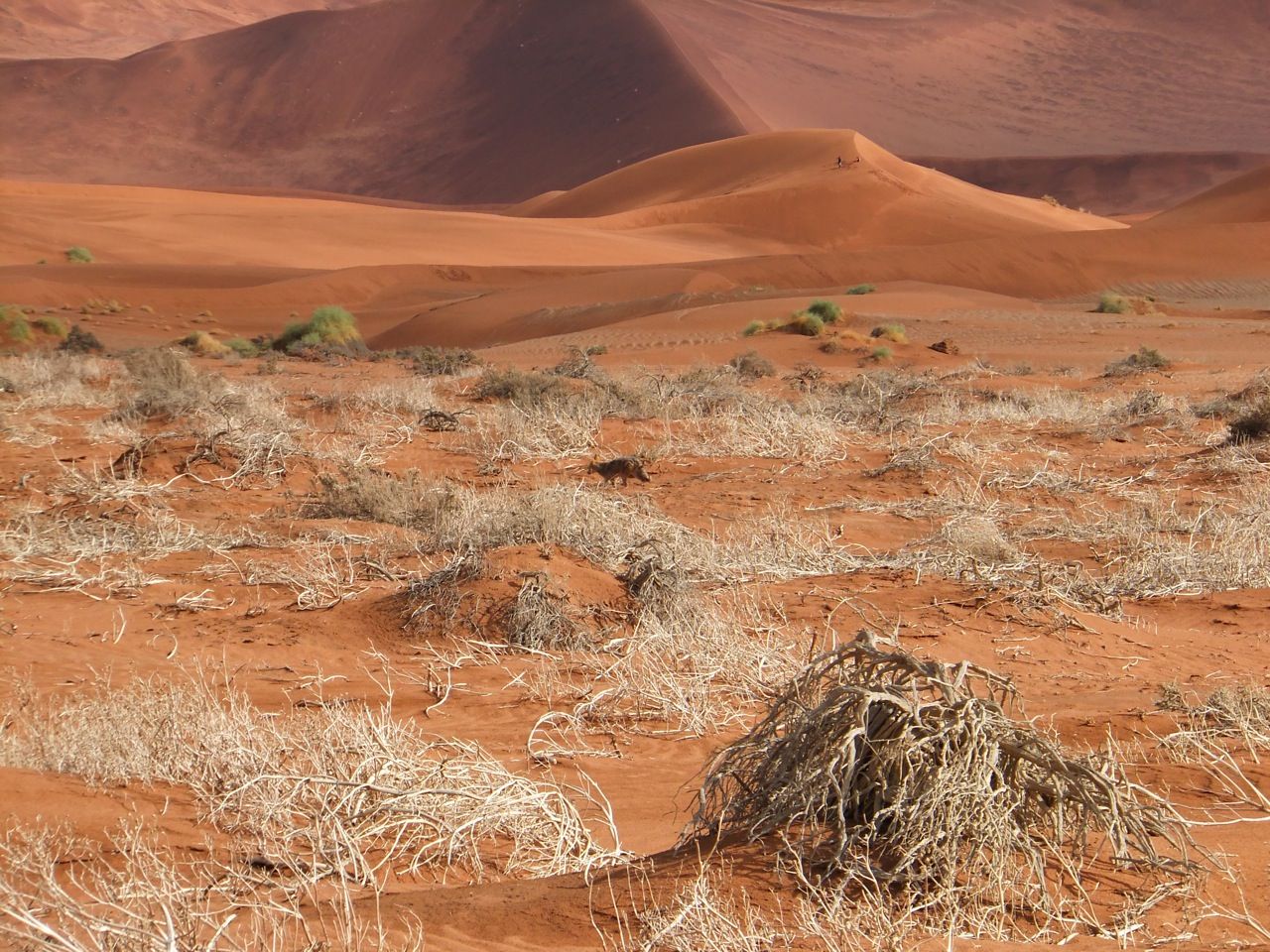 この国道は速度制限が120キロのところと60キロのところが交互にありそこを走行しながらルバンゴまでの到着時刻を計算する。この調子で行けば夕方には着くだろう。などど考えながら走行していると突然また悪路に。。今度は国境を超えたところの道の状態よりさらに悪い。ギアを二速に入れることができず、平均速度は15キロほどまで落ちる。デカイ穴に落ちないようによけ、またどうしようも無い時は超低速で穴を超えていく。ただアスファルトが断裂し崖崩れ状態、深い陥没の穴にはまったら転倒間違いなしなので本当に神経を使う。道の面積の内、95%が穴で残り5%が平面と言えば想像がつくでしょうか。大型トレーラー達も皆この道を通るので本当に辛そう。車輪が沢山ある分、バイクよりもゆっくりだ。 結果この状態の道が延々、100キロほど続くことになる。途中、部分的にこの酷い国道をさけるために多くのドライバーが走った自然に出来た側道がある。その道は幾分が走り易くギアをたまに二速に入れることが出来る。ただその道も大きな水たまりが途中に立ちはだかるので国道に復帰しなければいけない。国道は高い位置を走っていて側道は低い位置にあるので側道へ下るのと駆け上がるのをしばらくはそれを繰り返すことになる。ある時、側道から国道へ復帰しようとした時、路面の大きなギャップがバイクの底をヒットした反動で転倒してしまった。今回は傾斜が低い方向へバイクが倒れ、私自身は地面を転がることになった!地面を転がったのは久しぶりだ(笑) もちろん低速での転倒だったのと完全な装備のお陰でケガもない。ありがとう!ラフアンドロードとBMWのブーツ&グローブ、アライのヘルメット!(笑) バイクはタイヤのほうがハンドルより高い位置の状態で横たわっている!全ての荷物を降ろしてもそのままでは起こすことが出来ない。。お手上げ状態のところに反対側からやってきたトレーラーの運転手が声をかけてくれ助手の方と共に起こすのを手伝ってくれた(感涙)皆、困っている人をすぐに助ける習慣は本当に素晴らしい。やっとの思いでバイクに荷物を積んでいる最中今度は反対側にバイクを倒してしまった(恥)相当疲れているらしい。いつ終わるか判らない悪路を走り続けるのは本当に辛い。セスリエムからスワコプムンドに向かう長いダートは天国のように思えるほど。途中から常に気にし始めていたのは太陽の傾き。超低速走行のために一向に走行距離が伸びない。本日の目的地、ルバンゴに到着する予定の時間がどんどん遅くなっていく。暗闇になった場合、この悪路を走るのは自殺行為だ。とは言っても無情に時間が過ぎ、悪路は容赦なく続く。やっと奇麗な舗装路に出た!(嬉)ここからあとはルバンゴまで一直線!と思ったのはつかの間、すぐにまた悪路に。この精神的ショック、皆様わかります?(笑) どんどん日が暮れていく。16;00を過ぎた頃からトレーラー達が路上に車を停めて車泊の準備を始める光景を見かけるようになった。中には荷台の下と路面の間にベッドを取り付けている車も見た。そうして長い距離を走っていくんだね。 私ももう今日中にルバンゴに着くのは無理と判断しどこかで泊まらないといけない。しかし私はテントを持っていない。その辺にバイクを停めて寝る・・と言う事は無理なのだ。何か大きい土管を探すか、または人がいる村に行って馬小屋でもいいから寝床を提供してもらうかと考えるが人も歩いていない地域が続く。またもし寝る場所を確保出来たとしても食料がない。少しだけバイクにビスケットが積んである。水もあと僅か。こう考えると国境で渡してしまったリンゴ二個と国境屋に飲ませた水が愛おしく感じてしまった。