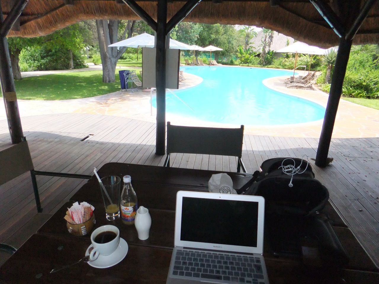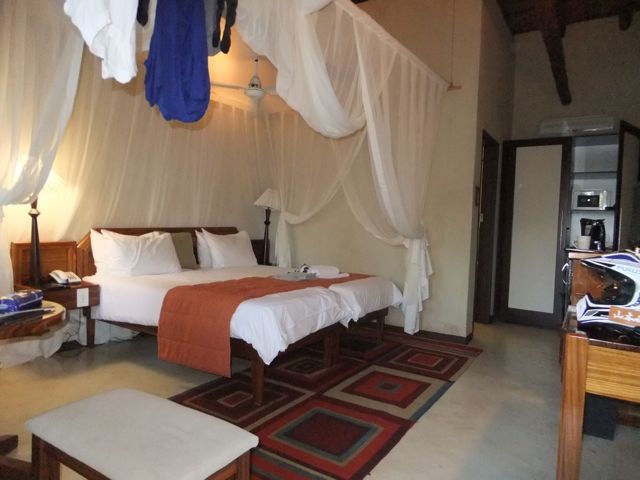 辺りが暗くなりかけてきたころにやっと村があり人がいる。路上にバイクを停めて村人が集まってるところに向かって歩く。疲労困憊で足どりが重い。ゆっくり彼らに向かって歩いて行くと皆、私に注目している。その内、歓迎的な笑顔をしている人がいたのでその人に話しかけてみる。とは言っても英語が通じないのでiPhoneに入れておいたポルトガル語のソフトを使ってここに泊まりたいということを伝えると、あと5キロ行けば町があるよと親切に教えてくれた。(感謝)本当に5キロほど走った所に町があり、バイクを停めて宿らしきところがどこか見渡していると遠くから指を差している人がいる。近くへいくと「ルバンゴならあっちだよ」と教えてくれてた。彼にも同じように「泊まるところを探している」と伝えると宿がある方向を一生懸命私に伝えてくれる。そうしているところに新しそうな車に乗った地元の方が何していると私達に声をかけ、結局その方が宿まで連れて行ってくれ宿の交渉もしてくた。もう、人に助けらてばかりです。宿で通された部屋は電気も使えず、お湯が出なくて水もほんのちょろちょろしか出ず、布団もなくシーツが一枚簡素なベッドにかけているだけ。トイレも流れない状態で吐き気をもよおすほどの異臭を放つ。それでも馬小屋よりいいし、下手すると木の下で身の危険を感じながら不安1000%で一夜を過ごすことになったことを思えばここは天国。朝になればこれでもかというくらいの豪雨。トタン屋根を叩く豪雨の音の大きさに耳を塞ぐほど。野宿をしていたかと思うと改めてぞっとする。ここの宿の人たちも皆親切。食事も十分出してくれて命拾いした。ここから少しいくともう道は奇麗でルバンゴまで一直線だと教えてくれた。少ししたら大雨の中をルバンゴに向けて出発だ。