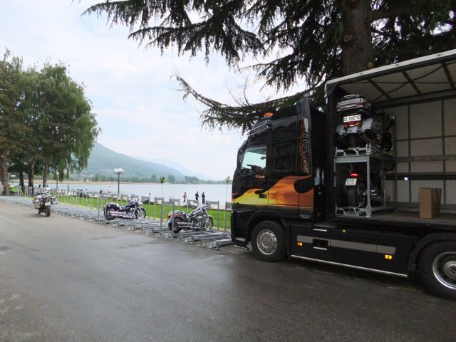 オフリド湖畔は観光客が多い。ハーレーを十数台?積んで来たトレーラーを発見。