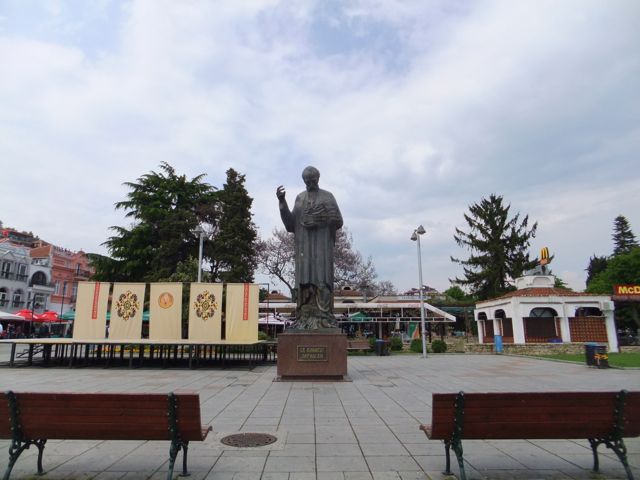 出発の朝、再度マザーテレサ像の前を一回りして、マケドニアに向かう。マケドニアの首都ではなくオフリドという町。この町は面している湖と町そのものが世界遺産に指定されている。