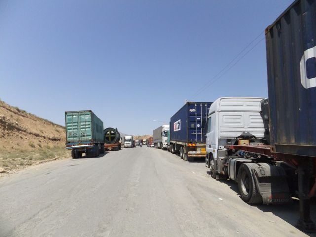 トラックの長い列がもうすぐ国境、を意味します。